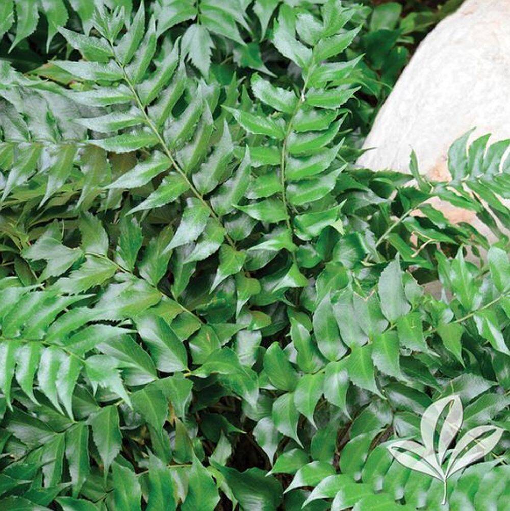 Stiff erect dark green shiny fronds of holly-like leaflets have coarsely fringed margins. Has a spreading growth habit and reaches 2 to 3 ft tall and wide. Use in containers, borders, or as groundcover.