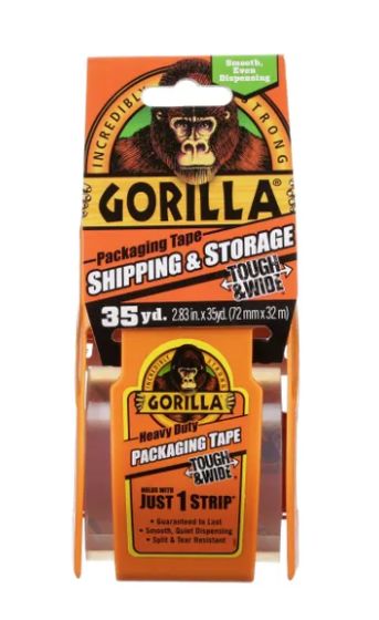 Gorilla Heavy Duty Packaging Tape Tough & Wide is nearly 3 in wide and extra thick allowing you to can seal boxes with Just 1 Strip. This tough packaging tape is split and tear resistant with an easy-to-grip dispenser. Gorilla Heavy Duty Packaging Tape is crystal clear and moisture and temperature resistant making it great for shipping, moving,