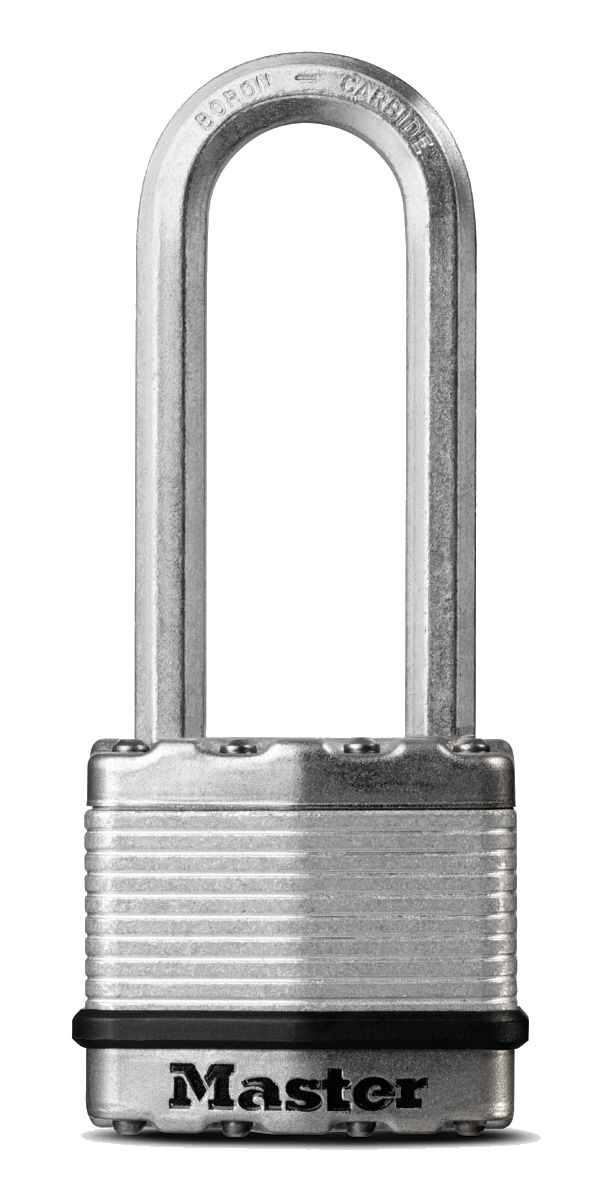 The Master Lock Magnum M1XKADLJ Laminated Padlock with Key features a 1-3/4-inch wide laminated steel body for maximum strength and reliability, and is surrounded by stainless steel and zinc outer components for weather resistance. The 5/16 in. (8 mm) diameter octagonal shackle is 1-1/2 in. (38 mm) long and made of Tough-Cut boron-carbide, 50% harder than hardened steel, offering maximum resistance to cutting and sawing. The 4-pin cylinder prevents picking and the dual locking ball bearings provide maximum resistance against prying and hammering.