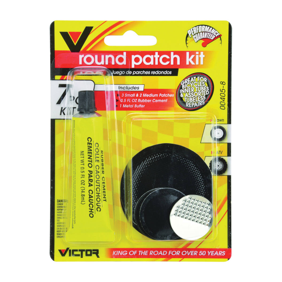 Includes (1) Metal Buffer and (1) 1/2 oz Rubber Cement, (2) 2-1/4 in Medium Round Patches, (3) 1-1/4 in Small Round Patches