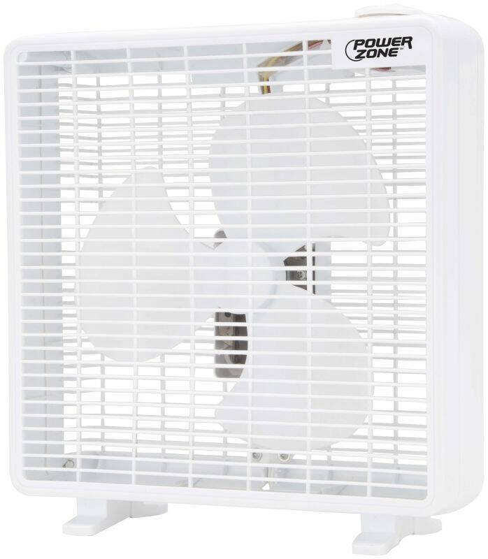 Box Fan, 3-speed motor, simple rotary switch control and built-in carry handle. Compact size, light weight plastic case. Rubber tipped base. ETL listed.