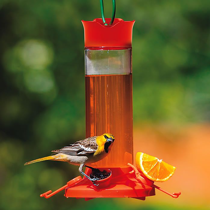 It's no secret that orioles have a sweet tooth. The Perky-Pet® Fruit Trio Oriole Nectar Feeder allows you to serve three of their favorite foods in one convenient location. The large reservoir can hold up to 30 oz of nectar, which is accessible through four feeding ports around the feeder base. This unique feeder also includes a jelly cup and orange spike, which attach to the ports so you can serve up an orange slice and a sampling of jelly - two of orioles' favorite treats! Orioles won't be able to resist visiting this enticing feeder.