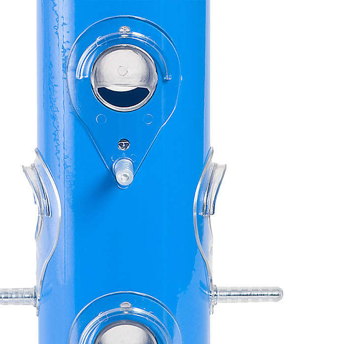 Bring charm and simplicity to your outdoor spaces with the Perky-Pet Blue Metal Tube Wild Bird Feeder. This sturdy metal feeder features vibrant blue color that is sure to look at home in any backyard. Birds wont be able to resist the look or the six ports. With this feeder, theres plenty of room for all of your feathered friends to dine. Plus, it holds up to 1 lb of black-oil sunflower seed or mixed seed so your birds will always be in good supply.