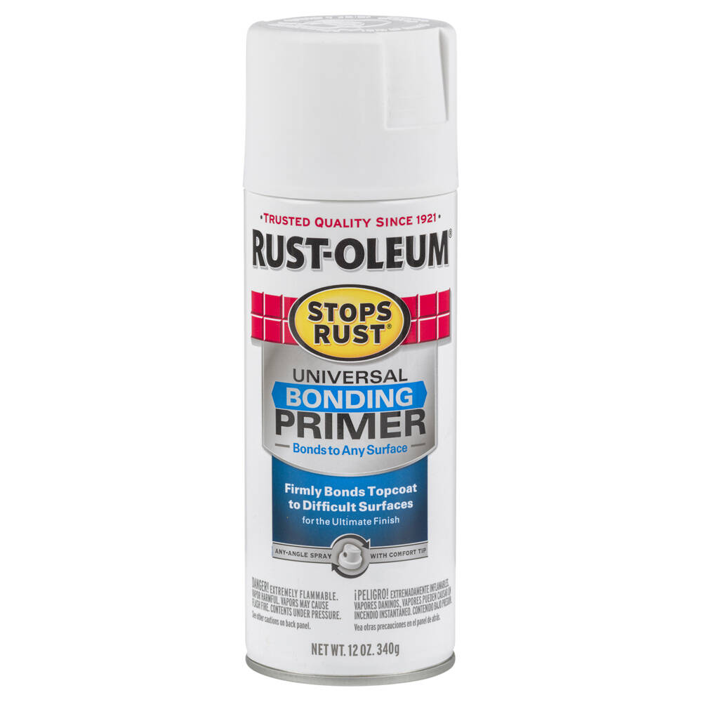 Rust-Oleum Universal Bonding Primer Spray Paint is specially formulated to firmly bond topcoats to even the most difficult to paint surfaces. Use with any topcoat, including solvent based and 2-part epoxies. It creates a smooth, rust resistant finish.