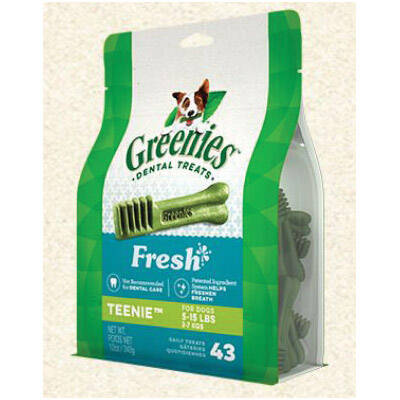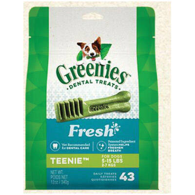 One Greenies™ fresh flavor dental treat is all it takes for clean teeth, fresh breath and a happy dog. Your dog can't wait to sink their teeth into these delicious dental dog chews because they are bursting with breath-freshening mint flavor and feature a delightfully chewy texture that fights plaque and tartar. Irresistibly tasty and incredibly powerful, Greenies™ treats for dogs are recommended by veterinarians for at-home oral care. Best of all, these dog treats are made with highly soluble ingredients that are easy-to-digest. Give your dog the mouth-wowing treat that helps promote oral health with Greenies™ dog treats.