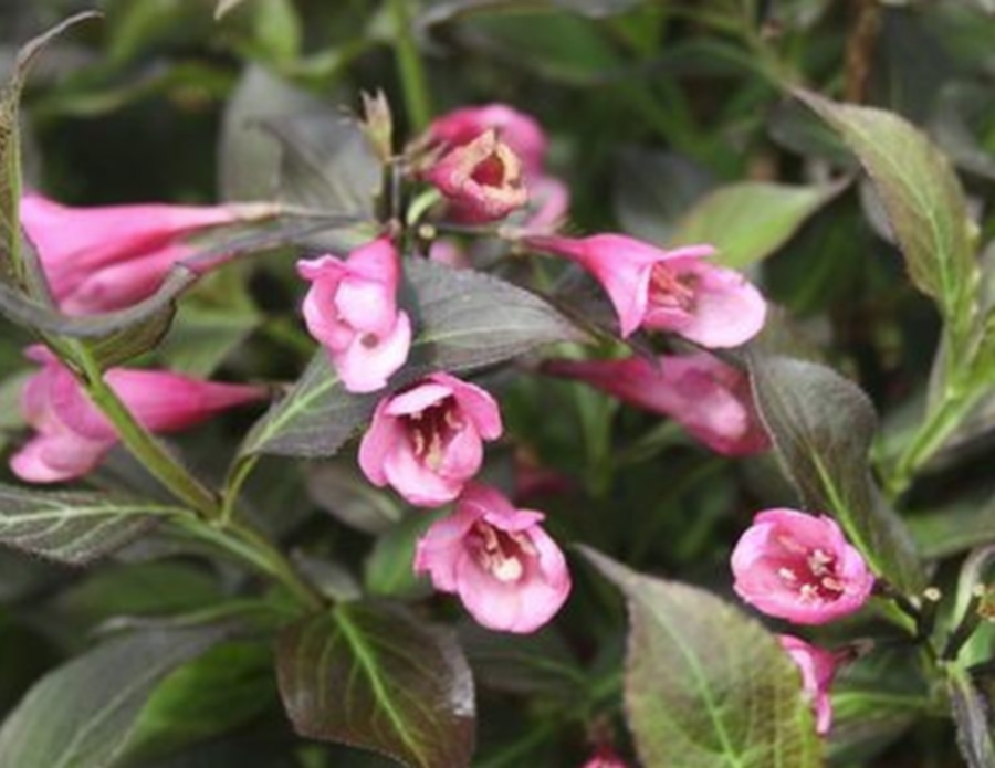 This old-fashioned, flowering deciduous shrub is a superior compact form with very dark foliage and deep pink flowers in spring that contrast well with the foliage. Mature height is 2 ft high and 3 ft wide. A great landscape plant, it retains the color interest throughout the season.