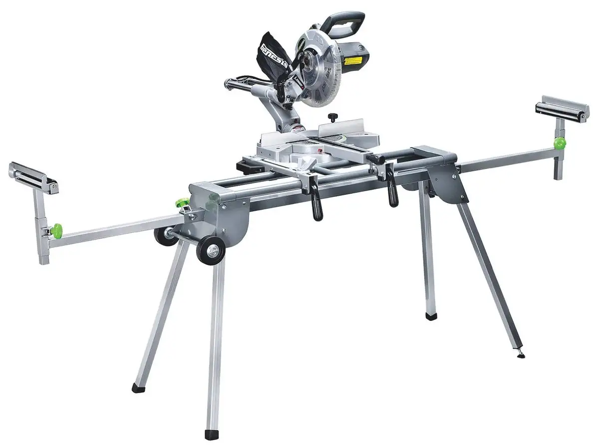 The Heavy Duty Universal Miter Saw Stand from Genesis is a rugged, all-steel support system designed for tradespeople who need a stable, portable platform for accurate cuts. Built to support up to 400 lbs, it accepts all Genesis and most other miter saws—including 12-inch sliding miter saws—so you can mount and remove tools quickly using the quick-release brackets. Material supports and extension arms adjust without tools, and integrated rollers plus positive stops keep stock feeding smooth and repeatable for long rip and crosscut work. When the job is done the quick-fold design and wheels make it easy to move and store, and the height adjusts between 32-1/4 and 39 inches while the length stretches from 41-1/4 to 110-3/8 inches to suit different jobsites. Includes two material supports, two saw mounting brackets, and eight sets of fasteners.
