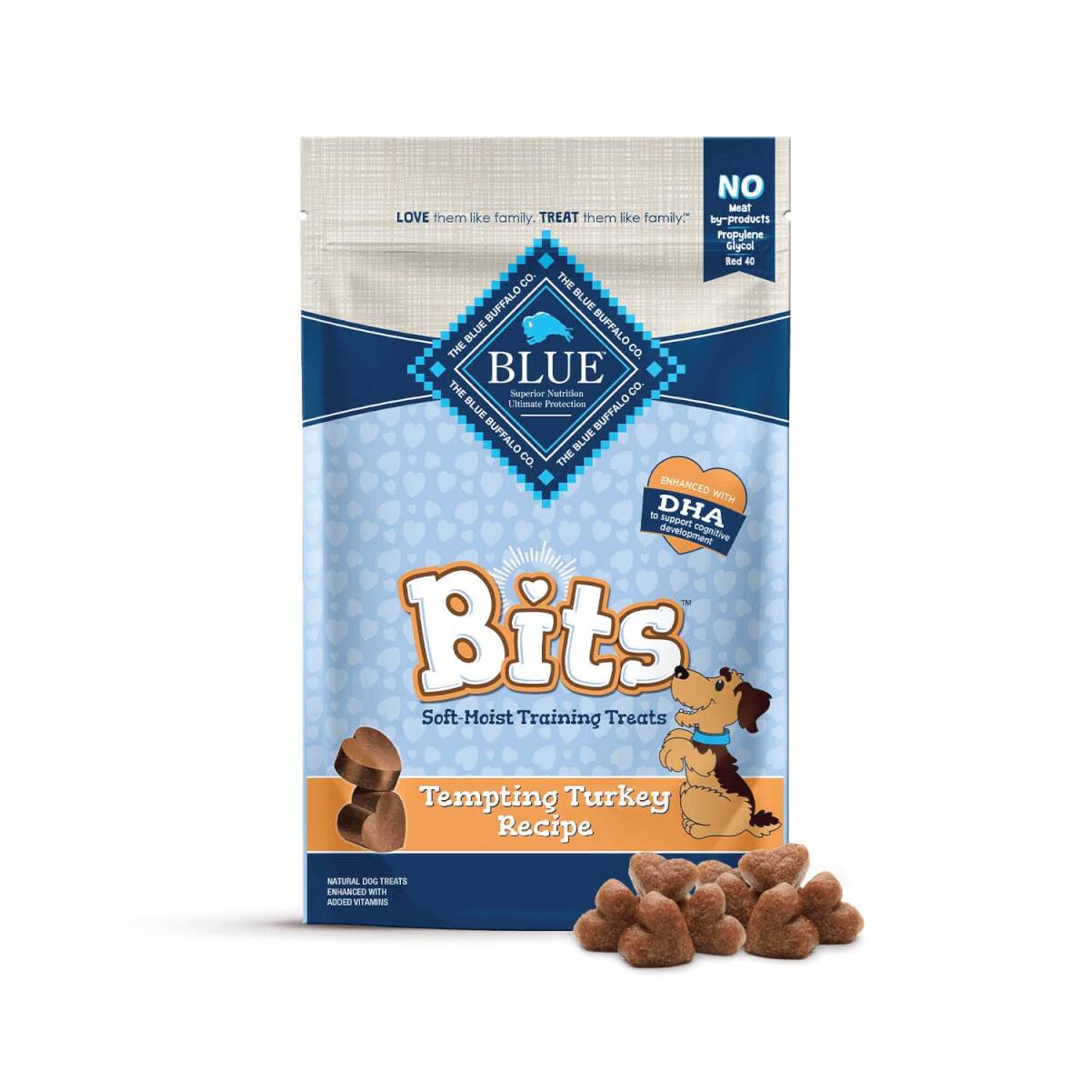 BLUE bits training treats are soft, moist and extremely tasty. Packed with delicious, protein-rich chicken, plus DHA to support cognitive development, BLUE bits are a healthy and nutritious reward that your dog will love.