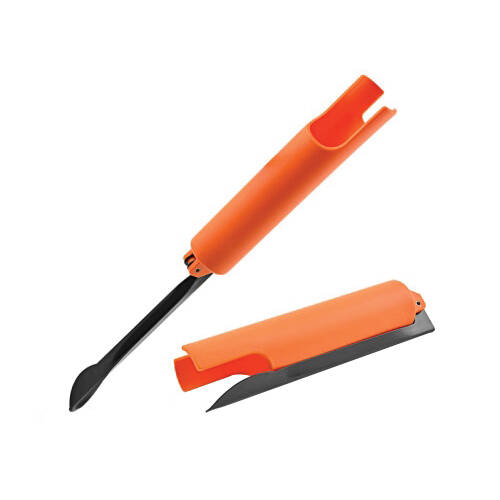 Folding rod holder is 18-1/2 in length and folds to a compact 9-1/2 in Accommodates spinning, casting and spincast rod styles. Metal spade easily and firmly inserts into the ground.