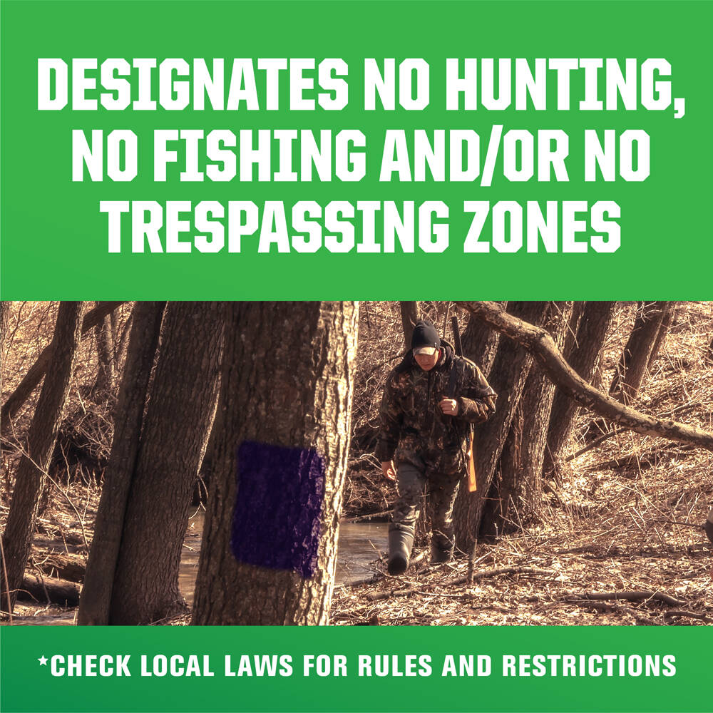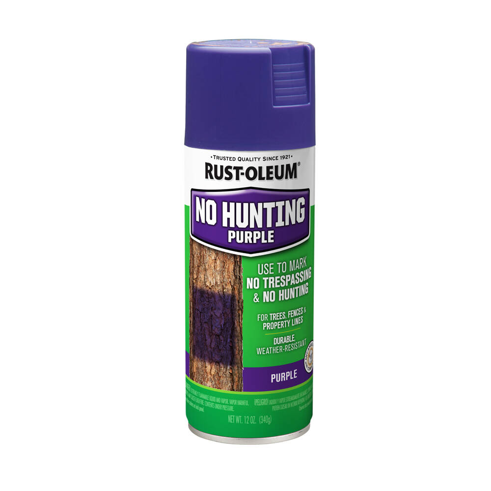 Rust-Oleum No Hunting Purple is a durable weather resistant finish formulated for marking trees, fences and property lines. This product is designed for use in states regulated by “No Hunting” paint statues.