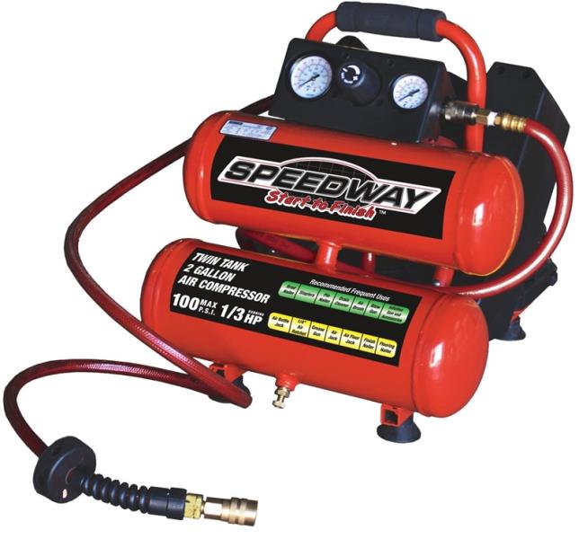 2 Gal twin stack, oil free oil compressor with 1/4 in x 25 ft auto rewind hose reel. Construction grade hose. Hose reel provides convenience and on-board storage all in one package. Low profile design for stability and safety. Push connect coupler.
