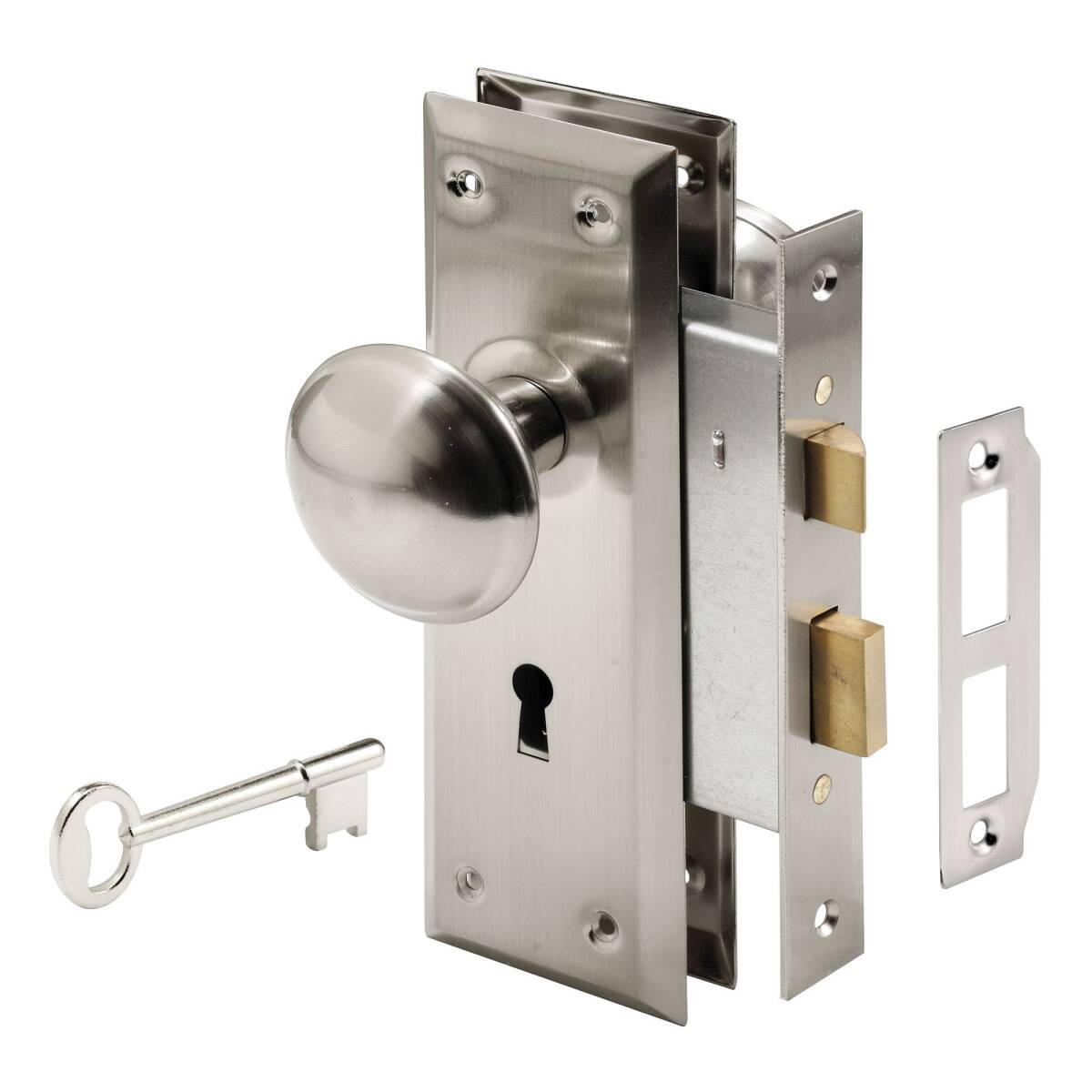 Mortise Lock Set, Keyed, Satin Nickel Satin nickel plated steel trim plates; case-hardened steel case; lock bolt is key activated both inside and outside; spare keys available on special order. Spare keys are available through special order. NOTE: These lock sets are for interior use only. Package of 1
