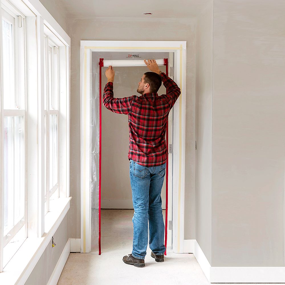 - Zipwall® double-sided tape securely holds the door panel while protecting the doorframe surface