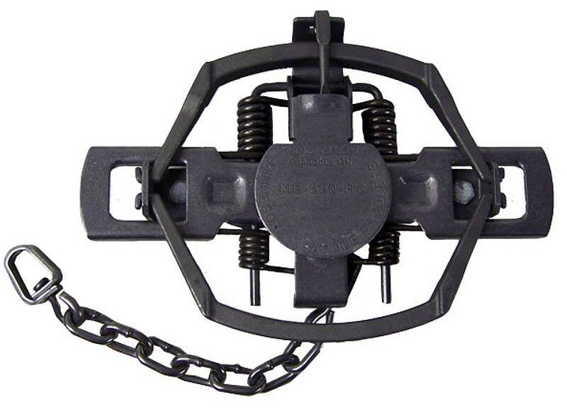 The MB-550-RC Four Coil Spring Cast Offset Jaws Trap has an outside jaw spread of 5-1/2-inches and an inside jaw spread of 4-3/4-inches. The cast jaw face is 3/8-inches thick and the offset is 3/16-inches. This trap has a Paws-I-Trip pan system and a night latched dog. Pan tension out of the box (un-waxed) runs an average of 3.1-pounds. Due to the additional power provided by the 4 coiling, this trap is not recommended if grey fox is your target animal.