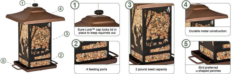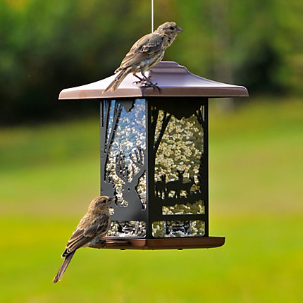 The Wilderness Lantern Wild Bird Feeder is a sturdy, attractive copper feeder designed to bring more feathered visitors to your yard. Its durable metal construction and patented sure-lock cap system help keep squirrels from raiding the seed while the bird-preferred U-shaped adjustable perches let finches, sparrows and cardinals settle in comfortably. Built-in seed-saving drain holes help prevent soggy, wasted seed after rain, and the feeder holds up to 2 lb of mixed, black oil sunflower, hulled sunflower or safflower seed. At 7 inches wide, the feeder fits nicely on a pole or hanging near a porch to create a dependable daily feeding station for songbirds and backyard birdwatchers who want low-maintenance performance with classic style.