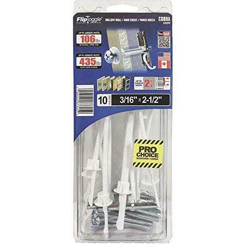 The Flip Toggle Bolt Anchor 3/16-24 from COBRA ANCHORS is a heavy-duty fastener designed for secure mounting in hollow walls, and is ideal when you need reliable support through drywall, plaster or other hollow assemblies up to 3 inches thick. You’d choose this anchor when a standard screw won’t hold — it requires a 1/2-inch hole and its updated one-strap design makes insertion and the flipping action smoother and faster, so installation is straightforward. The toggle mechanism spreads load behind the wall for a firm grip, and it can be used with any bolt length to suit the thickness of your fixture and substrate. Made in Canada, this flip anchor simplifies hanging and mounting tasks where a dependable anchor point in hollow wall material is required.