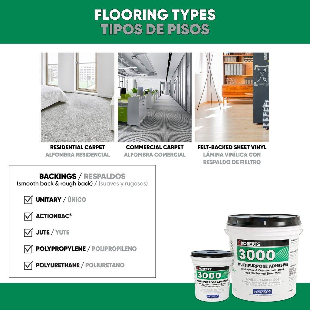 Roberts 3000 Multipurpose is a contract-grade adhesive formulated for the installation of most types of commercial carpet and felt-backed sheet vinyl. Formulated with a longer open time for optimal positioning of sheet flooring, plus develops tack for the installation of rigid-backed carpets.