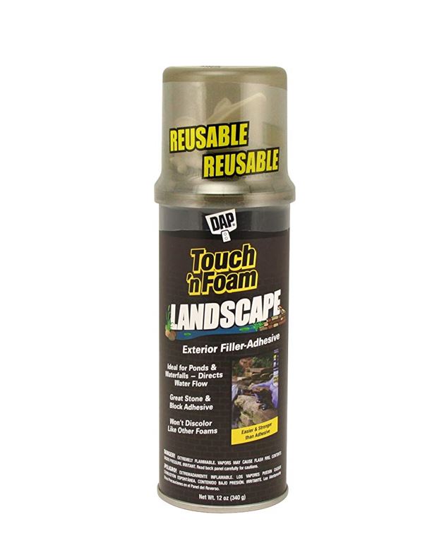 Reusable nozzle. Black colored UV resistant foam retains its color and blend into surroundings. Expands to fill gaps and voids. Can be used to replace loose mortar in rock walls and used to direct water flow in pond or water fall applications. Safe for use around fish or plants. Fills knot holes in trees to seal out pests. Use as a craft foam for artificial plants. Bonds to rock, stone, cement, plastic and wood.