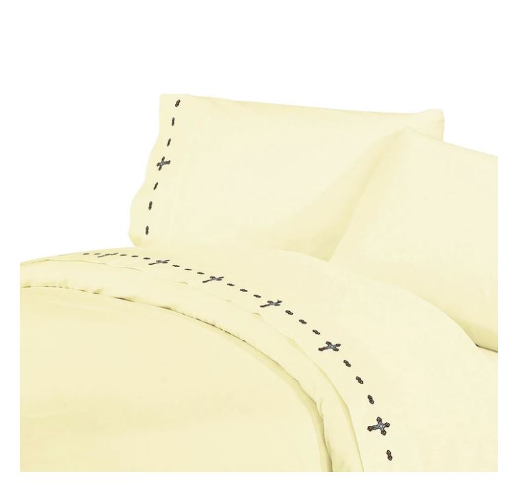 Enchanting and understated, these cream 350 thread count cotton sheets feature detailed cross embroidery. This set is easily paired with many of the other bedding sets in the western collections. Imported.