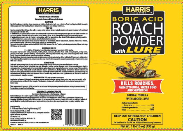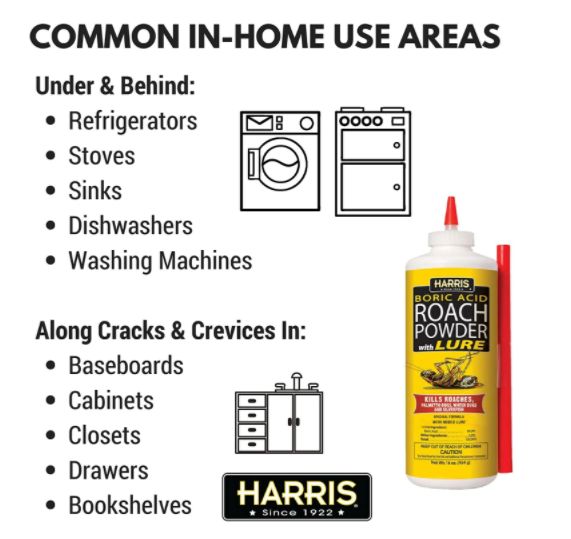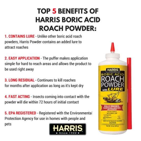Harris Boric Acid Roach Power with lure kills Roaches, Palmetto Bugs, Waterbugs and Silverfish. Puffer bottle with included straw reaches into cracks and crevices where insects hide. Continues to kill roaches, palmetto bugs, water bugs and silverfish for weeks after application as long as it's kept dry. Insects coming into contact with the powder will die within 72 hours after initial contact.
