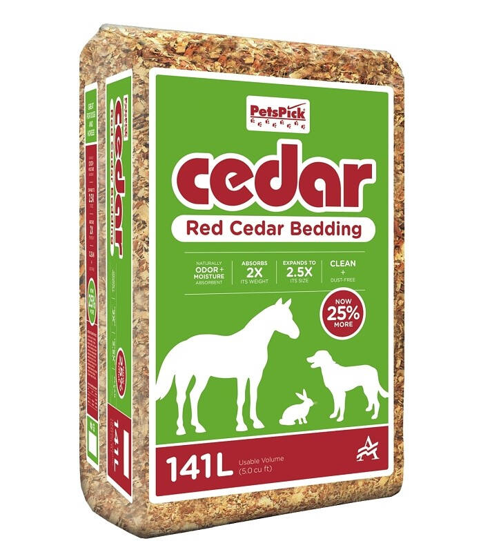 All natural and aromatic kiln dried red cedar bedding. Keeps your pet warm and odor-free. Great absorbent bedding for horses and livestock. Produced sludge-free bedding can also be used as a natural mulch and compost. 2 cu-ft (56 L) compressed expands to 5.0 cu-ft (141 L).