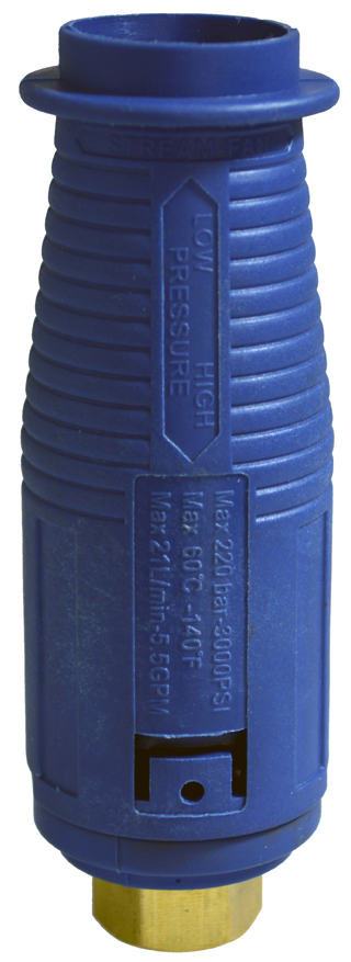 1/4 in female national pipe thread inlet. 3.5mm orifice multi regulator nozzle. Used when high and low pressures are needed. This nozzle easily switches between a solid or flat spray pattern without having to change nozzles. The low pressure mode is great for the introduction of downstream soaps. The spray pattern adjusts from a solid 0° to a flat 80° spray pattern with a twist of the nozzle head. 300° F. 3,200 PSI.