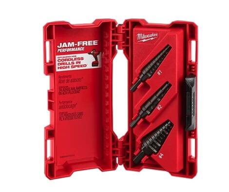 For user convenience and accuracy, each bit has laser-engraved reference marks you can see while drilling. The 3-flat Secure-Grip shank ensures a solid connection with the drill chuck. The Step Drill Bit 3-Piece Set includes bits #1 (48-89-9201), #2 (48-89-9202) and #4 (48-89-9204). Jam-Free Performance in high speed with most professional 18 volt cordless drills with lithium-ion battery technology.