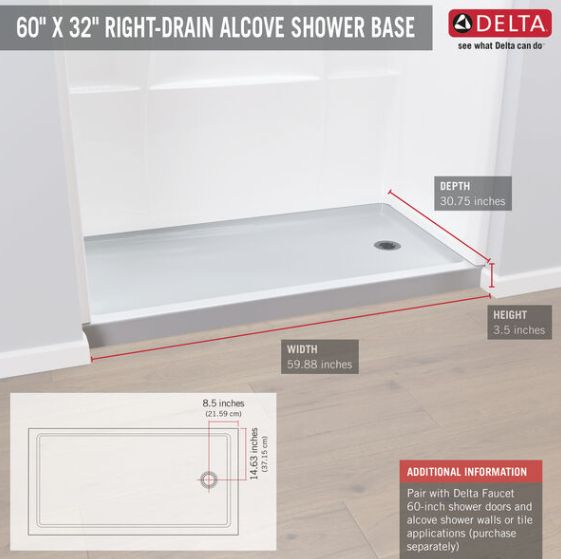 This 60 x 32-inch rectangular high-gloss white acrylic shower base is a clean, low-maintenance foundation for updating a bathroom or converting a 60 in. x 32 in. bathtub into a shower. Its premium non-porous acrylic surface stays bright white to match porcelain fixtures and wipes clean easily, while the right-side drain accommodates existing plumbing layouts. Measuring 59.88 in. W x 30.75 in. D x 3.5 in. H, it fits standard 60 x 32 in. alcoves and installs direct-to-stud for a secure, long-lasting fit. Designed to pair with Delta’s Classic 400 32 in. x 60 in. x 74 in. three-piece direct-to-stud shower surround (model 40104, sold separately), this shower base provides a simple, attractive starting point for bathroom remodels and tub-to-shower conversions.