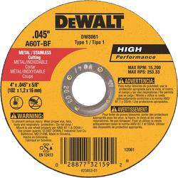 Crafted for fast cutting and long life, DeWALT-type 1 HP metal cutting wheels feature a thin 0.045 in wheel design for quick, burr-free cuts and a proprietary material mix for extended wheel life. Aluminum oxide grain delivers aggressive cutting action. 2 full sheets of fiberglass offer durability and safety.