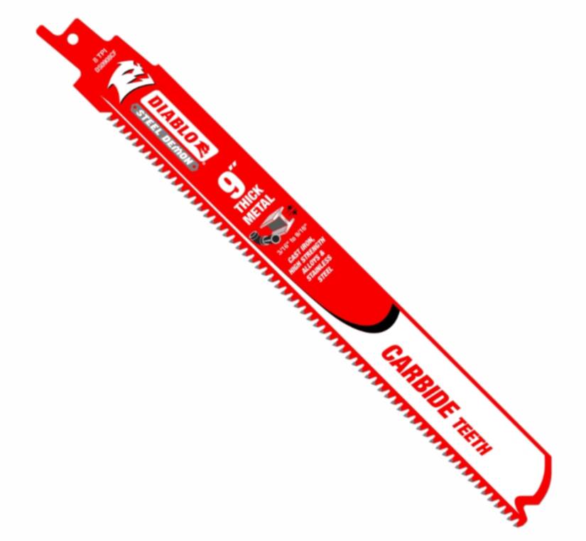 The Diablo Steel Demon Carbide-tipped reciprocating blades are the first carbide-tipped blades designed for extreme metal cutting; including high strength alloys, cast iron, and stainless steel. This high performance carbide-tipped blade delivers unmatched 50 times longer cutting life than standard bi-metal blades in extreme thick metal cutting applications between 3/16 to 9/16.