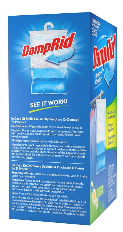 DampRid Hanging Moisture Absorber, Net Content: 15.4 oz, Box, Solid, Odor/Scent: Fresh, Odorless, Off-White, Compositions: Calcium Chloride, Sodium Chloride, Potassium Chloride, Specific Gravity: 2.15, Melting Point: 369 to 1420 deg F, Boiling Point: 350 to 3500 deg F, Density: 15.4 lb/gal
