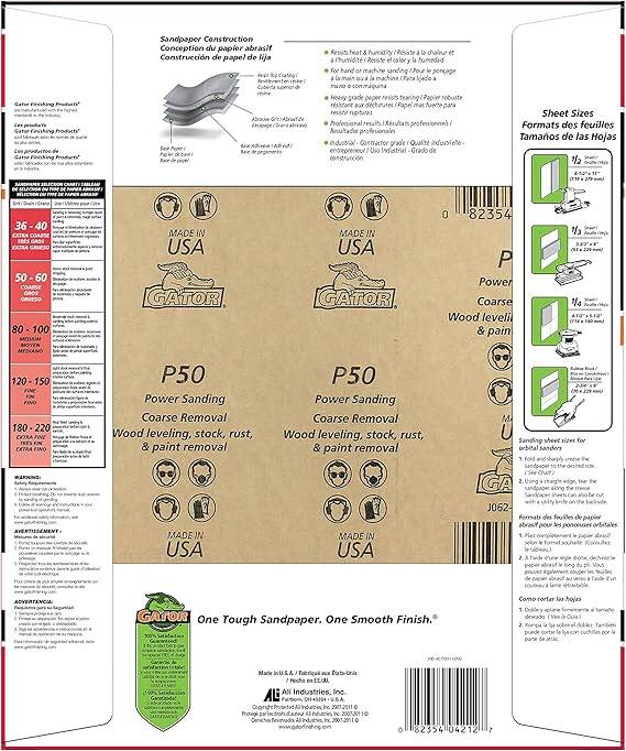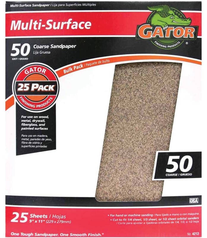 Gator's multi-purpose aluminum oxide sandpaper provides excellent performance at a value price. These sheets are ideal for both hand and power tool sanding on wood, metal, fiberglass and painted surfaces.