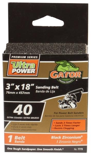 For use on power belt sanders. The bi-directional flush joint allows the sanding belt to run smoothly in both directions. The resin bonding system resists heat and humidity, extending the life of the sanding belt. Manufactured with Zirconium Oxide, this pack of cloth backed Gator Black Zirconium Ultra Power sanding belts will sand 3 times faster and last 3 times longer than regular sanding belts.