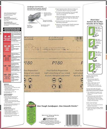 Gator's multi-purpose aluminum oxide sandpaper provides excellent performance at a value price. These sheets are ideal for both hand and power tool sanding on wood, metal, fiberglass and painted surfaces.