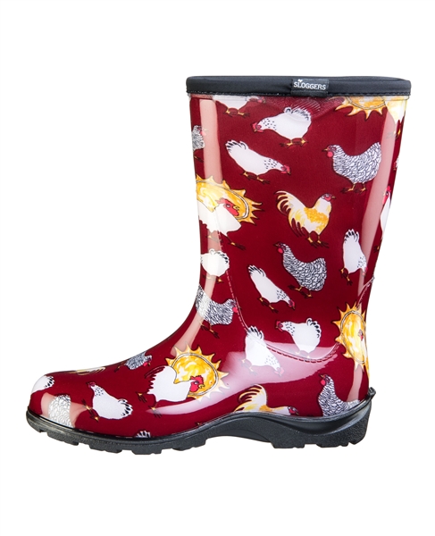Slip into waterproof comfort with our Chicken Print Red mid-calf 10 in rain and garden boot. Lower and wider than traditional rain boots, there is room for a wider calf or to tuck your pants into. Features our "All-Day Comfort" insoles for maximum comfort and our signature deep-lug tread for great traction. Easy on and easy to clean up. You'll soon know why Sloggers are America's #1 Backdoor Shoe. Note: prints may vary slightly from boot to boot. Women's sizes 6 -11. Proudly Made in the USA.