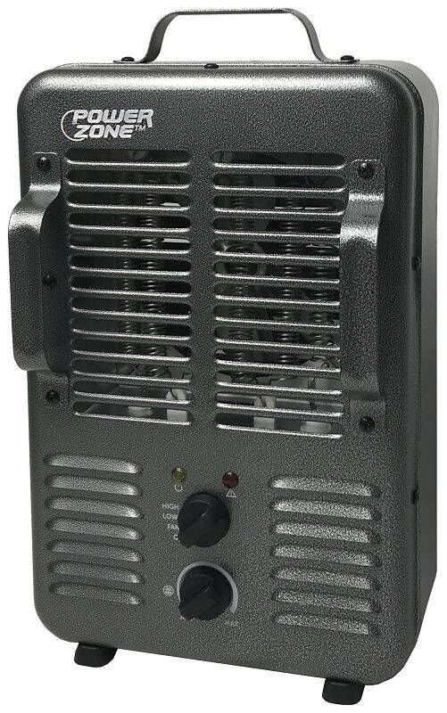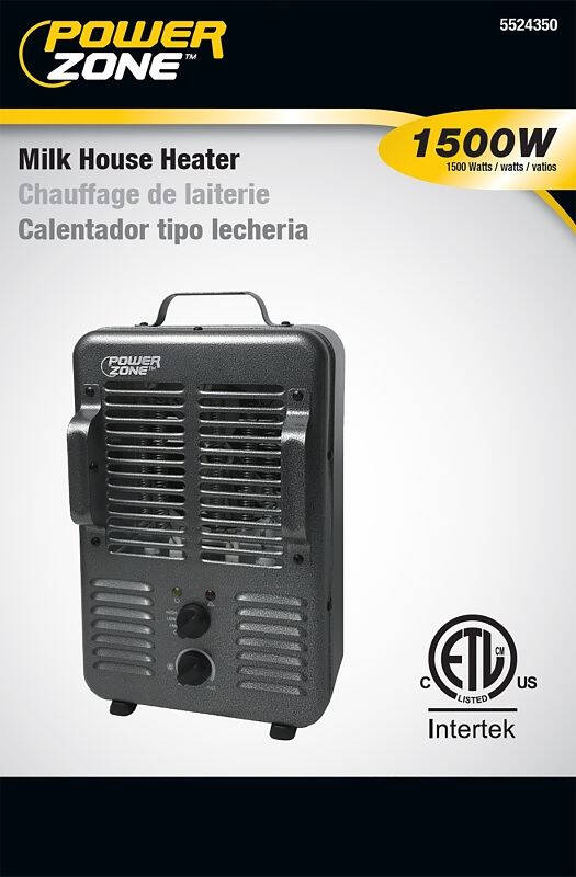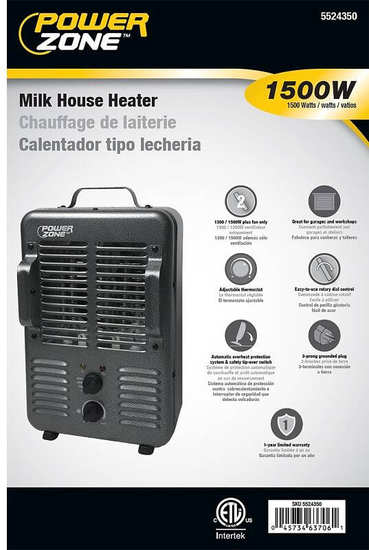 PowerZone Deluxe Portable Milk House Heater offers (2) 120 V, 12.5 A heat stages, 60 Hz, 1300/1500 W, 72 in cord length, durable metal housing material, adjustable thermostat, tip-over switch and overheat protection. Suitable for garages and workshops. Size: 10 in W, 15 in H, 7 in D.