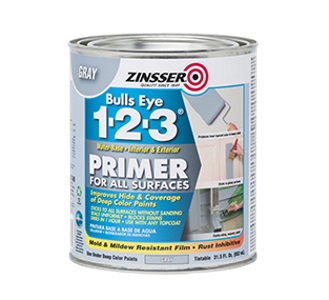 Zinsser® Bulls-Eye 1-2-3® Gray Primer is an all purpose, high performance, water-based primer for interior and exterior residential, commercial and industrial applications. Bulls-Eye 1-2-3 Gray Primer has excellent stain blocking resistance, is fast dry, and has excellent adhesion to glossy surfaces. Use Bulls-Eye 1-2-3 Gray Primer with rich or dark topcoat colors to improve their hide and coverage. May be used under and over any oil or latex architectural paint. The dried film is mold and mildew resistant.