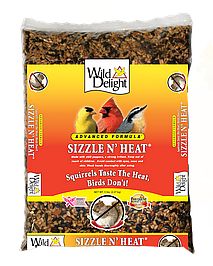 A premium hot blend designed for BIRDS ONLY. Industry studies show that Squirrels are listed as the #1 reason for people leaving the bird feeding category. Squirrels dominate feeders, create a mess and eat much of the seed, nuts and fruits. After much development and product testing, we created Sizzle N' Heat, a squirrel-deterrent product. While this is not a squirrel-proof product, our studies showed it to be a very effective squirrel deterrent. While squirrels may still visit and feed at feeders, once they get a taste of the hot seeds, most will look for other sources of food. As with any Wild Delight product, ensuring the best bird feeding experience is the #1 goal. So Sizzle N' Heat is filled with the same highly desired ingredients birds love, with none of the filler ingredients.
