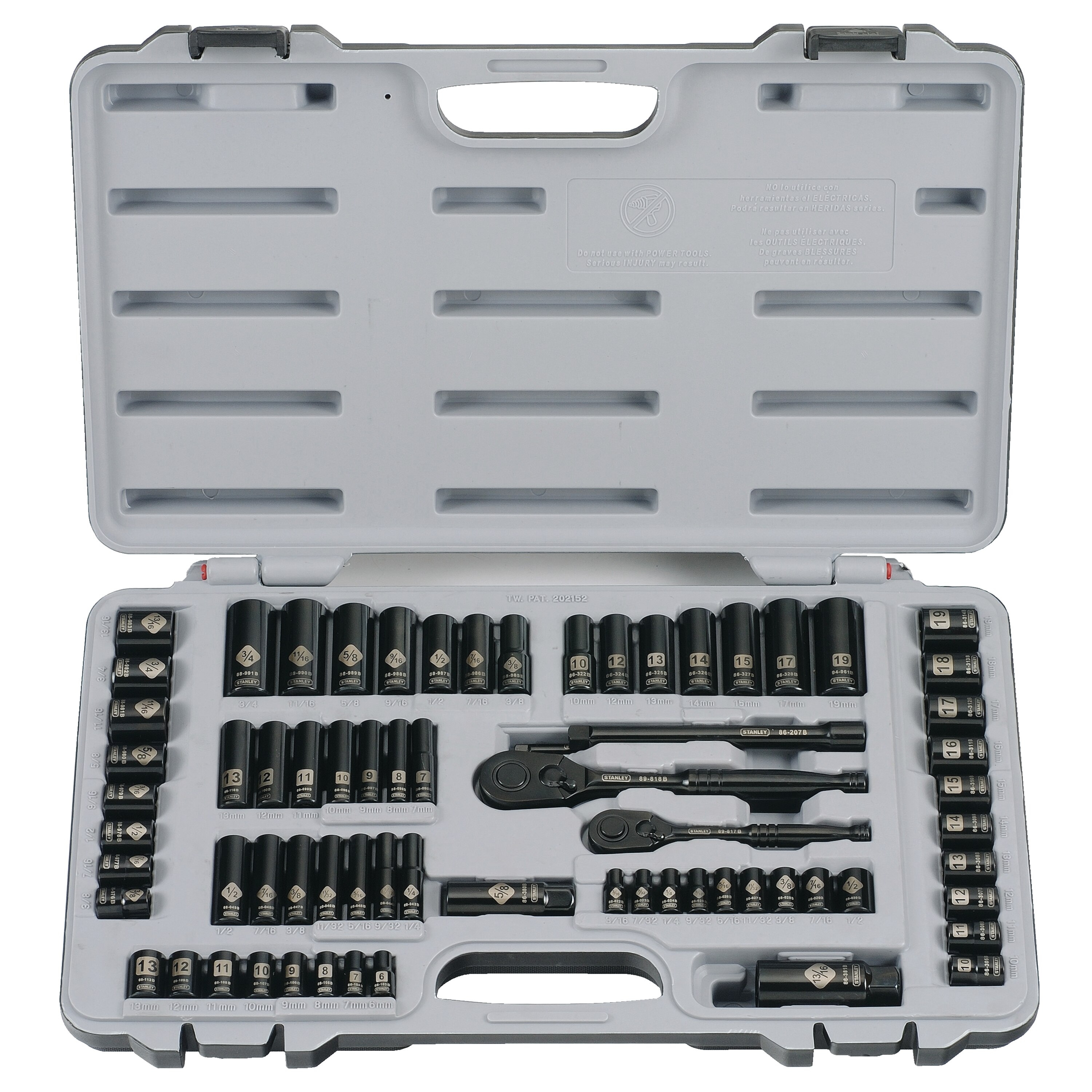 Includes (33) 3/8 in Drive Sockets (30) 1/4 in Drive Sockets (1) 3/8 in Drive Pear Head Ratchet (1) 1/4 in Drive Pear Head Ratchet (1) 3/8 in Drive Spark Plug Socket- 5/8 in (1) 3/8 in Drive Spark Plug Socket- 13/16 (1) 1/4 in Drive Extension Bar- 3 in (1) 3/8 in Drive Extension Bar- 6 in Blow Molded Carry Case