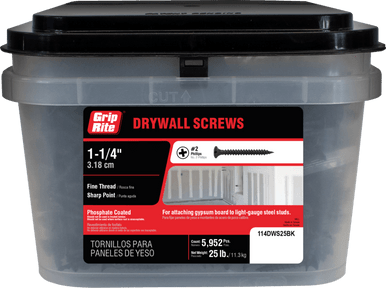 Grip-Rite Drywall Screws 1-1/4x6 Twinfast 25-Pound offer a straightforward solution for securing gypsum board to studs when you need reliable, purpose-built fasteners. These #6 diameter screws are 1-1/4 inches long with a fine thread, making them suited to gripping drywall and sheet materials to wood or light-gauge metal framing. The Twinfast designation identifies them as part of Grip-Rite’s drywall line, and their size makes them a common choice for interior wall and ceiling installation, patching, and trim work where a shorter screw is appropriate. Use them when hanging single-layer drywall, repairing damaged panels, or installing backing for cabinets and shelving to achieve a snug hold without over-penetrating the substrate.