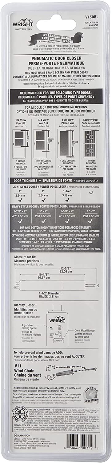Wright Products most popular heavy-duty closer. This closer can be mounted on all out swinging medium to heavy weight storm doors, full view storm doors or security doors. Closer has a full 90-degree opening range, is factory lubricated and has an adjustable closing speed.