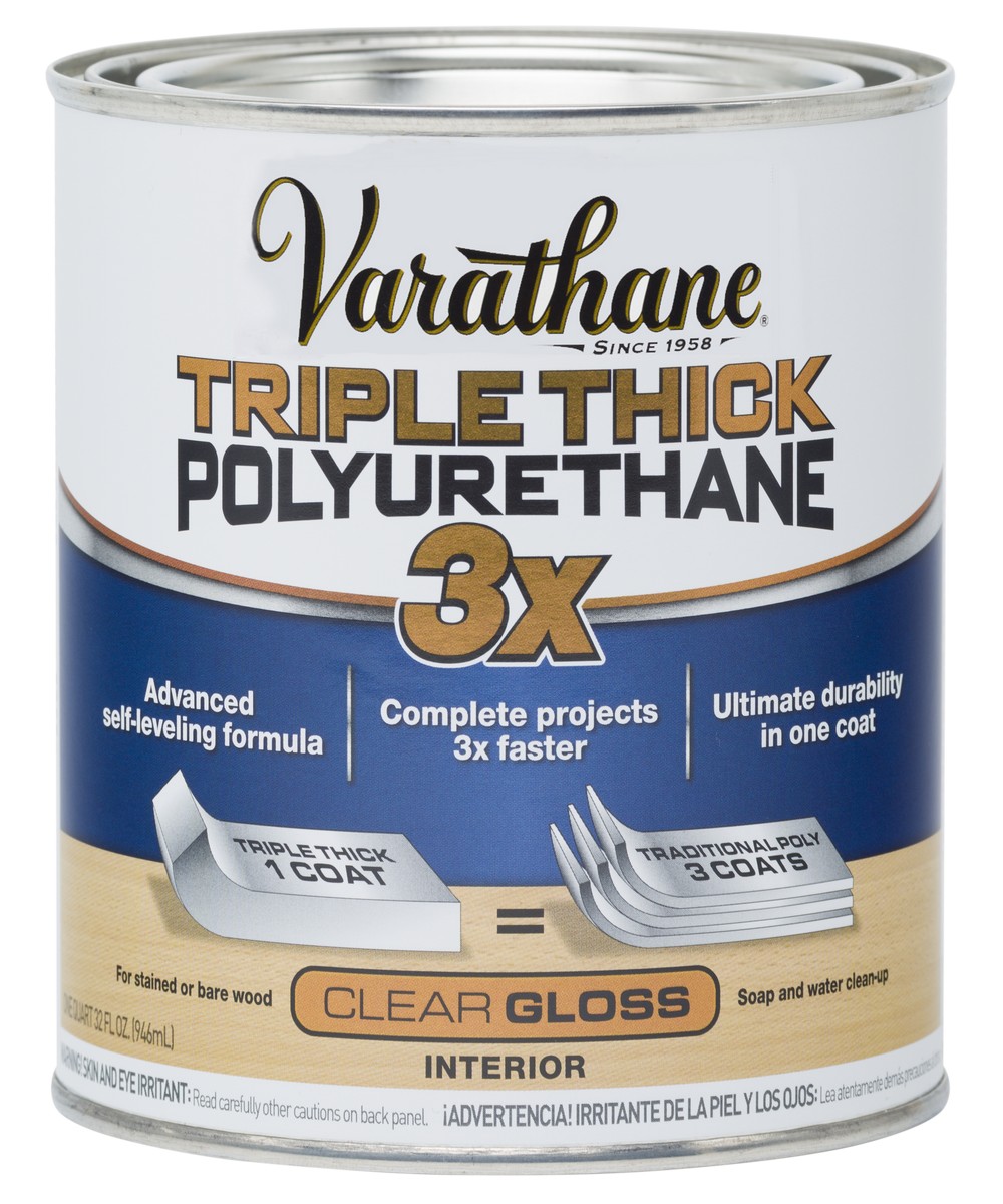 Varathane Triple Thick Polyurethane is 3X thicker than a traditional polyurethane. It is an advanced self leveling formula that allows projects to be completed in one coat while offering excellent scratch and stain resistance. It also provides fast dry times as well as the convenience of soap and water clean-up. It is suitable for use on all interior wood surfaces including furniture, doors, trim and more.