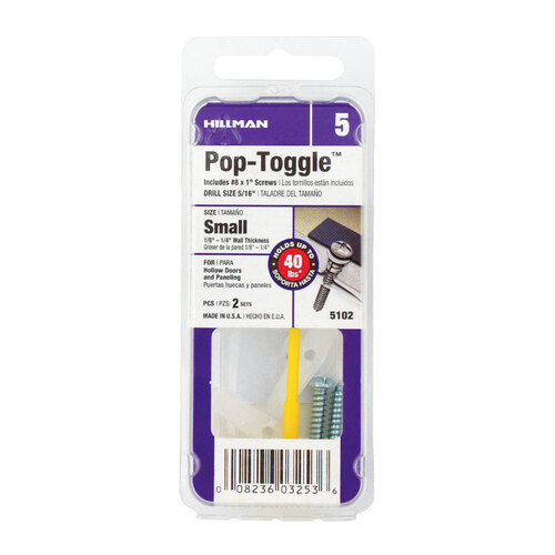 This 1/8-inch small wall anchor with screw and pin pop-toggle from HILLMAN is a compact hollow-wall fastener designed to give you a secure hold in drywall, plaster and tile, perfect when a simple screw alone won't do. You’d reach for it when mounting lightweight fixtures like small shelves, towel bars, mirrors or picture frames where a neat, reliable anchor is needed. The anchor uses a pin pop-toggle mechanism and comes with a pan head Phillips sheet metal screw for easy driving and a flush, finished look. It installs using a 5/16-inch drill bit to create the proper hole for the toggle to engage behind the wall. Two fasteners are included, offering a quick solution for odd jobs and finishing touches around the home.