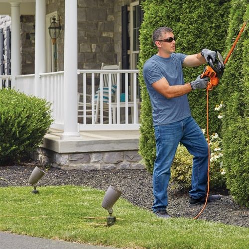 This 20-inch Electric Hedge Trimmer is great for routine trimming of large hedges and shrubs Plus, its SAWBLADE™ at the end of the blade lets you cut large branches up to 1.5 in thick. With its lightweight design and full wrap-around handle, its designed for greater comfort and control.