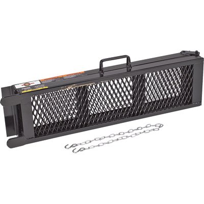 This One Steel Fold Up Ramp gives you a sturdy, portable way to load gear and equipment onto trailers or trucks. Built from one-piece heavy-duty steel with an angle steel frame and mesh floor for grip, it features a carry handle and safety chains, and is rated to 400 PSI for reliable general-purpose use.