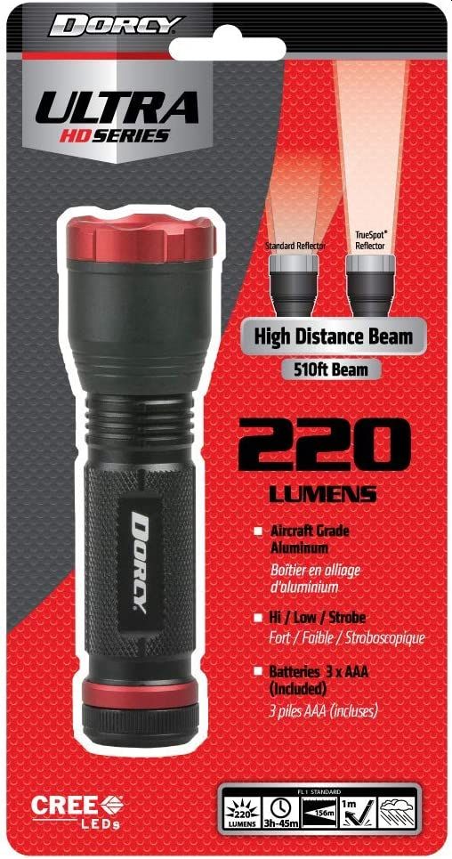 This 220 lumen flashlight is part of Dorcy Ultra Series of aluminum lights. With True Spot Technology that provides 100%+ increase in beam distance and made of thick gauge aircraft grade aluminum. With the rubber booted tail cap on/off switch and premium matte finish make these lights the ultimate tool.
