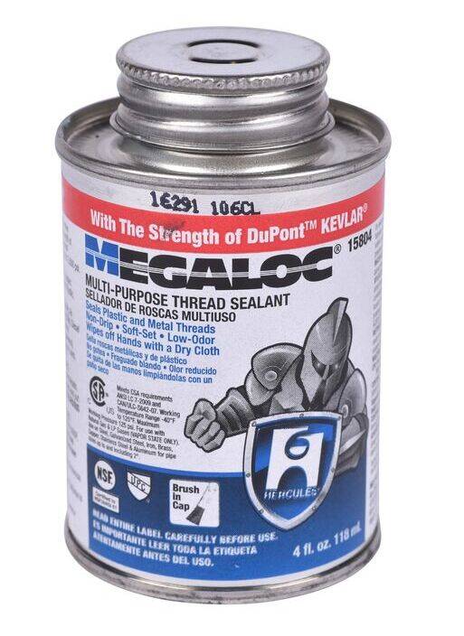 Hercules® Megaloc® is a multi-purpose thread sealant made with DuPont™ Kevlar® for use on metals, including steel, stainless steel, brass, copper, aluminum and plastic. This pipe dope wipes clean from hands and tools with a dry rag and is safe to use with water lines. Its odorless formula is non-separating, non-flammable and non-hazardous, and resists hardening and cracking. Behold the power of Hercules®, products built to last and trusted by plumbers to withstand even the toughest conditions.
