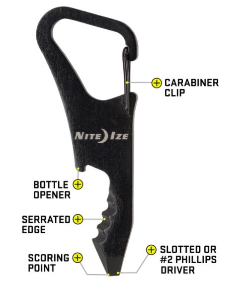 - 5-in-1 multi-tool includes: carabiner clip, bottle opener, serrated edge, scoring point, slotted or #2 Phillips screwdriver
