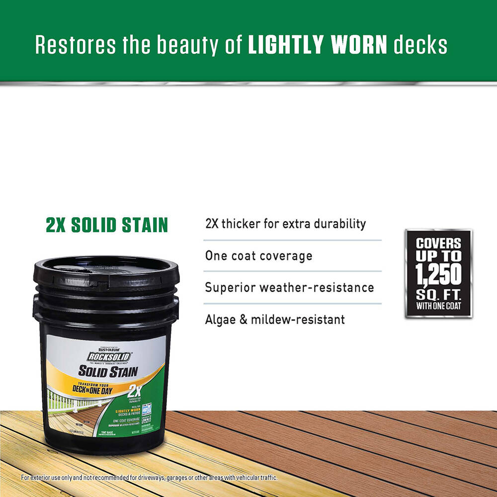 RockSolid Tintable Deck Coat transforms your deck in one day eliminating the need for stripping and sanding. This ultra-thick paint allows for one-coat coverage, and the high-build, water-based acrylic coating is specially designed for moderately worn decks and patios.