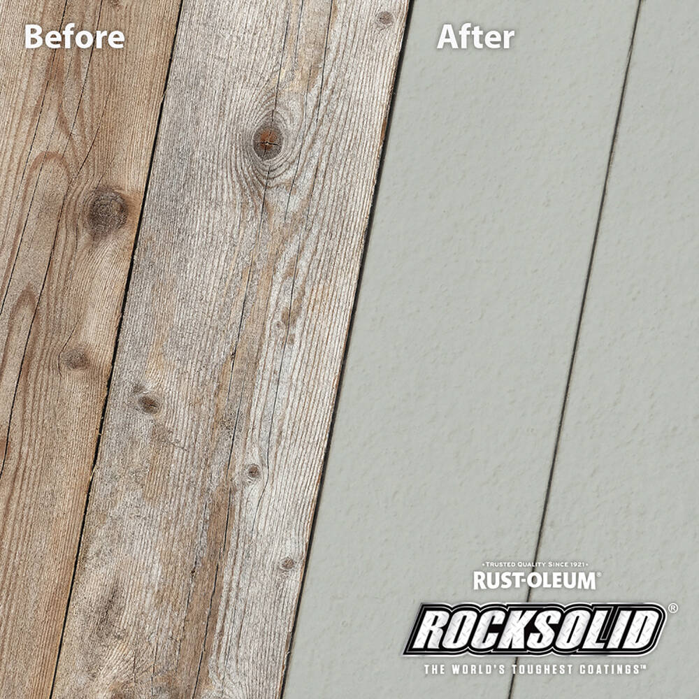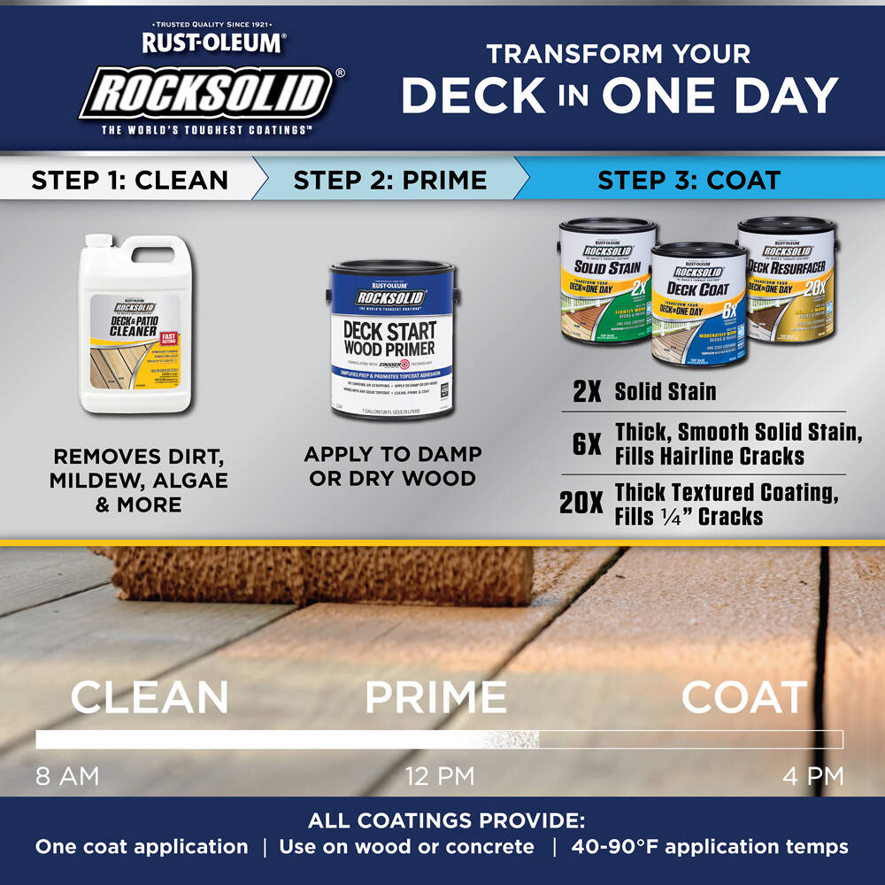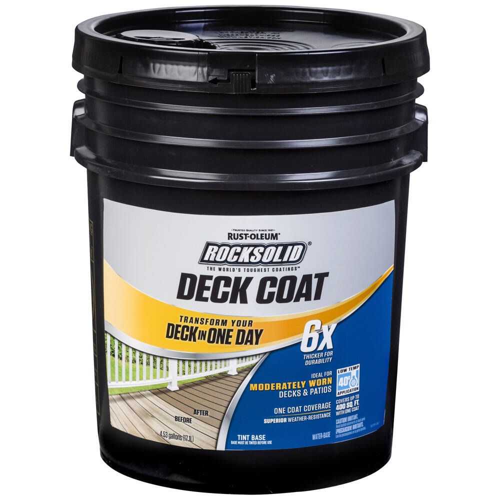 RockSolid Tintable Deck Coat transforms your deck in one day eliminating the need for stripping and sanding. This ultra-thick paint allows for one-coat coverage, and the high-build, water-based acrylic coating is specially designed for moderately worn decks and patios.